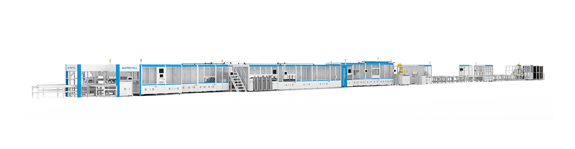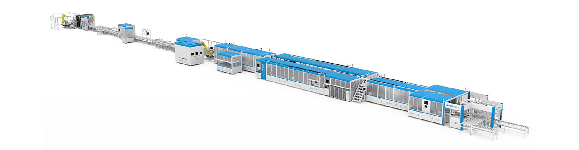 该产线是将软包电芯组装为模组的自动化生产线,其工艺流程包括:电芯上料、电芯处理、涂胶烘干、模组堆叠、涂胶入壳、极耳折弯整平、极耳焊接、采集线焊接、外壳焊接、外观尺寸检测、EOL测试等。