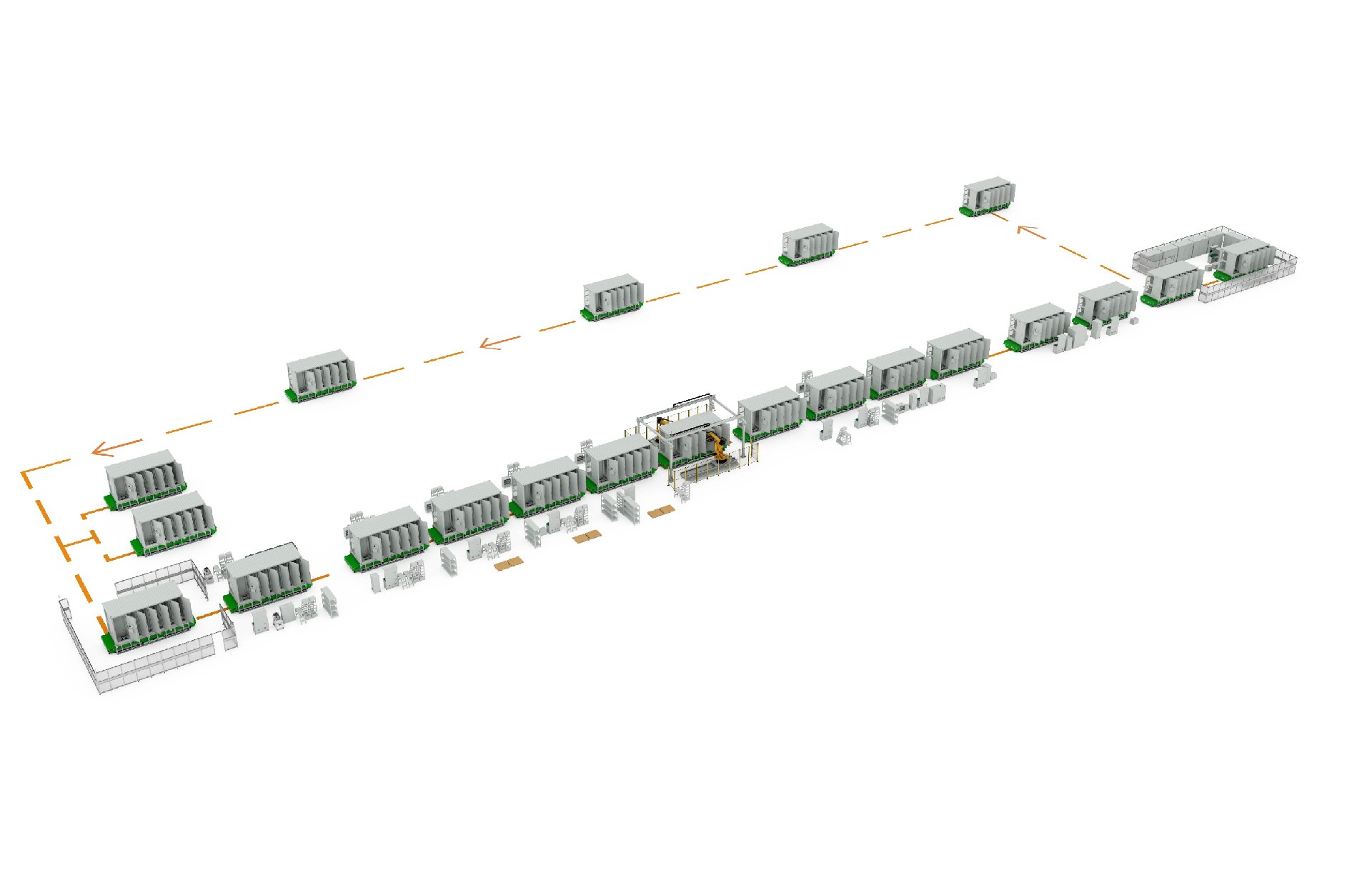 储能集装箱装配解决方案集成了集装箱装配线、重载搬运系统及仓储系统。 其工艺流程包括:集装箱上/下线、集装箱预装、安装动力线及电气系统、PACK簇安装&预紧、PACK簇拧紧、PACK簇接线、绝缘耐压测试&安装铭牌、集装箱弱电系统调试、PCS交直流测试等。